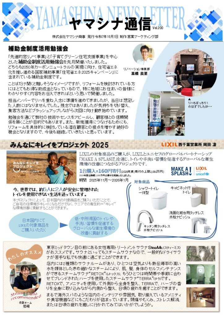 ヤマシナ通信は、メーカー様、協力会社様などに毎月お届けしている情報発信ツールです。今月は9月に行われた補助金制度活用勉強会について感じたことを高橋が書いています。今後も、地域にお住まいの皆さんに、リフォームに関する情報やわかりやすい勉強会などを開催していきます。