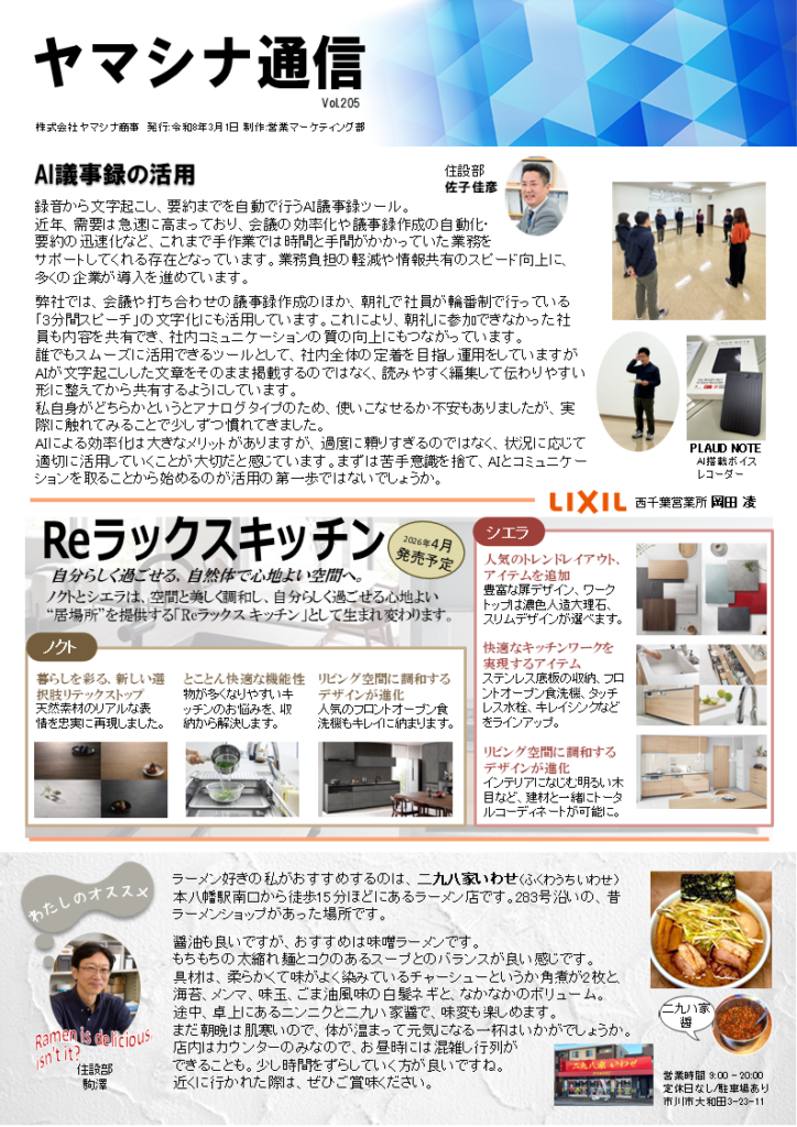 ヤマシナ通信は、メーカー様、協力会社様などに毎月お届けしている情報発信ツールです。今月は、AI議事録について佐子が記事を書いています。AI議事録は、議事録作成の時間を大幅に削減し、会議直後に要約が完成しているという優れたツール。録音から自動で文字起こし、要約してくれるので、弊社では朝礼で活用しています。さて、その効果は・・・。