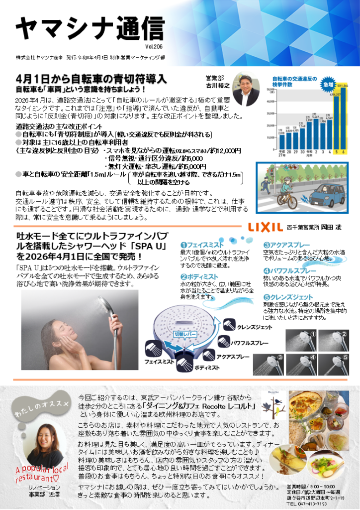 ヤマシナ通信は、メーカー様、協力会社様などに毎月お届けしている情報発信ツールです。今月は、4月1日から導入される自転車の「交通反則通告制度(通称:青切符)」について、古川が書いています。ながらスマホや傘差し運転、逆走、無灯火などは反則金が科されます。ヤマシナスタッフも自転車通勤者が数名いるので気を付けたいものです。